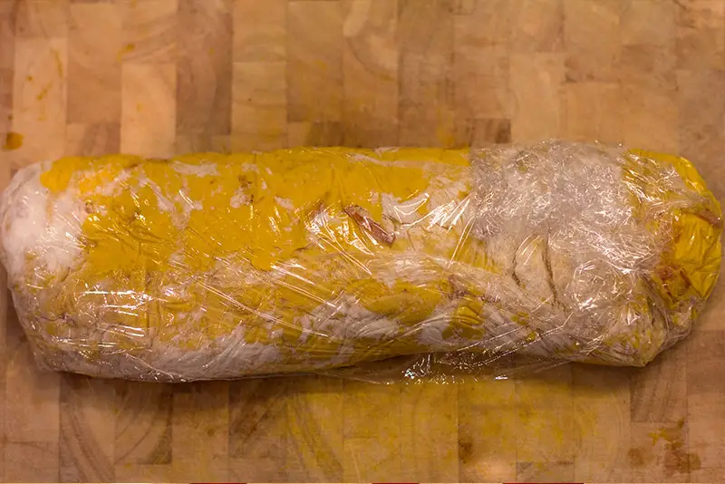 - Die Masse geben wir auf eine Frischhaltefolie und formen daraus eine Wurst und geben sie für etwa 10 Minuten in kochendes Wasser.