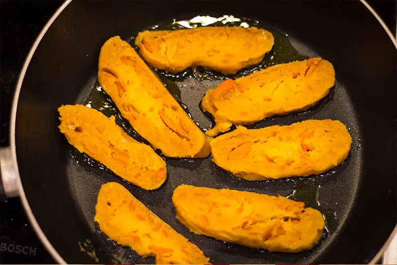 - Anschließend schneiden wir unsere Hokkaidowurst in Scheiben und braten diese mit etwas Öl scharf in der Pfanne an.