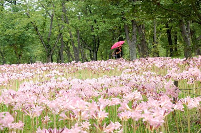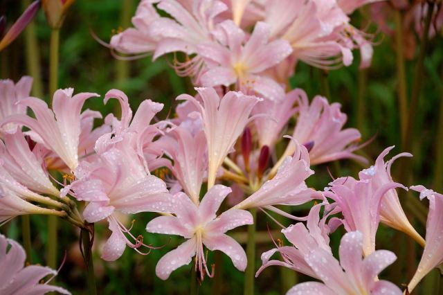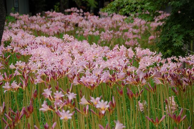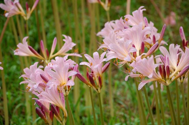 ヒガンバナ科で、ヒガンバナより1ヶ月早く淡紅色の花を付ける。有毒とか。