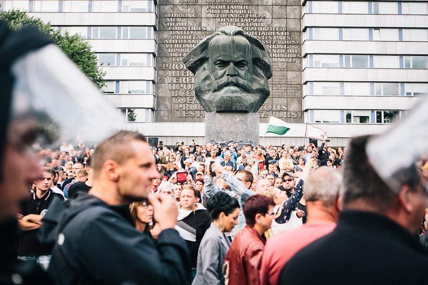 Am Karl-Marx-Monument im Zentrum von Chemnitz versammelten sich am Montag die rechten Demonstranten. © Thomas Victor für ZEIT ONLINE