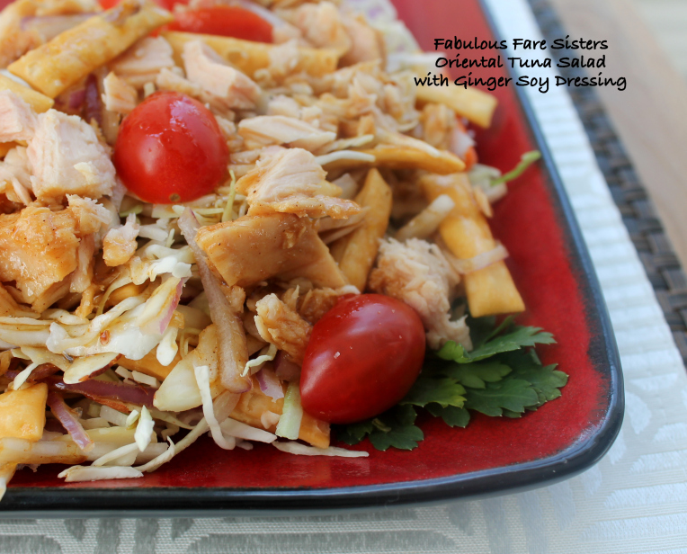 Here’s another great idea for lunch…taking the classic Oriental Salad (you know, the one with the ramen noodles) and changing it up a bit. I’ve replaced the ramen with crispy wonton strips and added cherry tomatoes and fresh flaked tuna…then topped it with a yummy Ginger Soy Dressing…