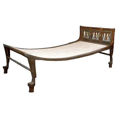 Es könnte ein wirklich funktionales Stück Wohnmöbel gewesen sein. Es hat die charakteristische gekrümmte Form, mit einer gewebten GemüsefaserMatratze mit Kalkbeschichtungen zwischen den Hauptrahmen bedeckt. Diese Kurve ermöglicht eine bessere Durchblutung für den Schläfer. Es besteht aus Ebenholz und Löwenpfoten an den Füßen und ruht auf einem abgerundeten Sockel.