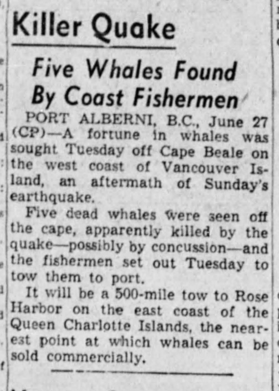 In der Vergangenheit haben vertikale Erdbeben oft starke Kompressionswellen erzeugt, die Großwale sofort töten und ihre Kadaver auf der Oberfläche schweben lassen. Dies geschah kürzlich in Chile, als bei einem Erdbeben 20 Sei-Wale getötet wurden ( Link ). Wie links gezeigt, geschah es 1946 sogar in der Nähe von Vancouver Island. (Ref: The Oregon Statesman Wed Jun 26 1946).