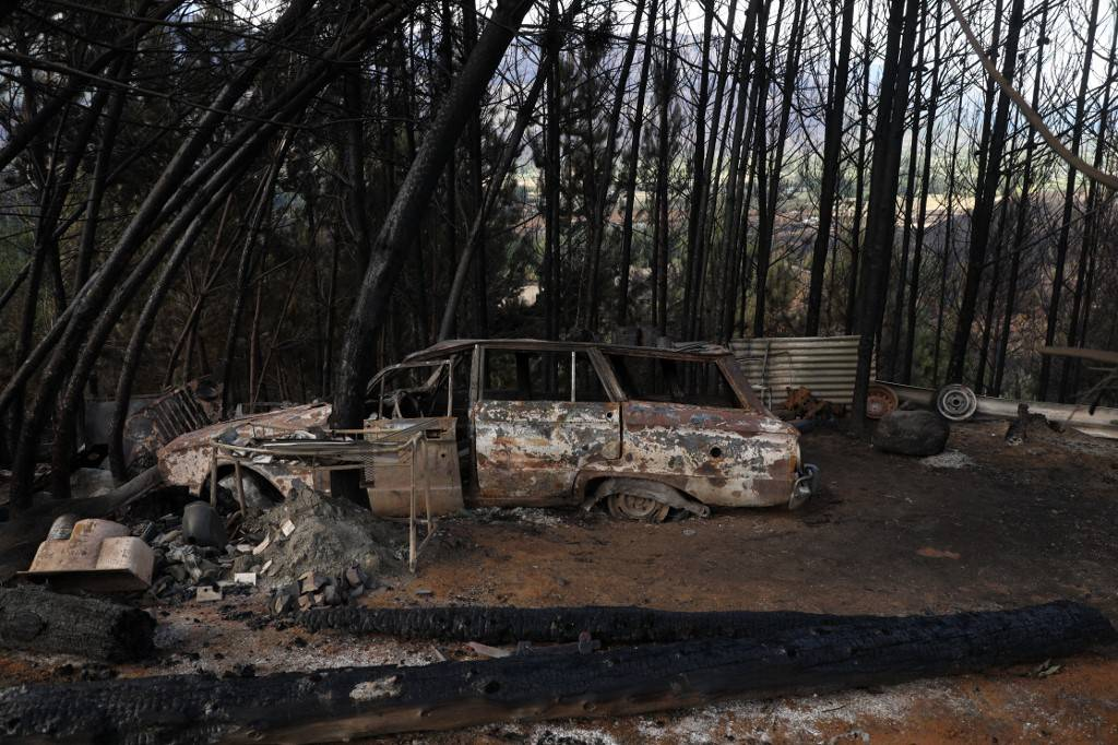 In der Stadt Las Golondrinas in der argentinischen Provinz Chubut wurde am 11. März 2021 nach einem Waldbrand ein Auto gesehen. Sieben Menschen wurden verletzt und weitere 12 verschwanden am Mittwoch aufgrund der Waldbrände, die das argentinische Patagonien verwüsteten. Foto: Francisco Ramos, AFP