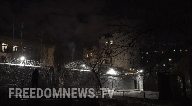 Rauch steigt aus der russischen Botschaft in Kiew, Ukraine. Leute wurden gesehen, wie sie früher Kisten trugen. Die Botschaft wurde zur Evakuierung aufgefordert
