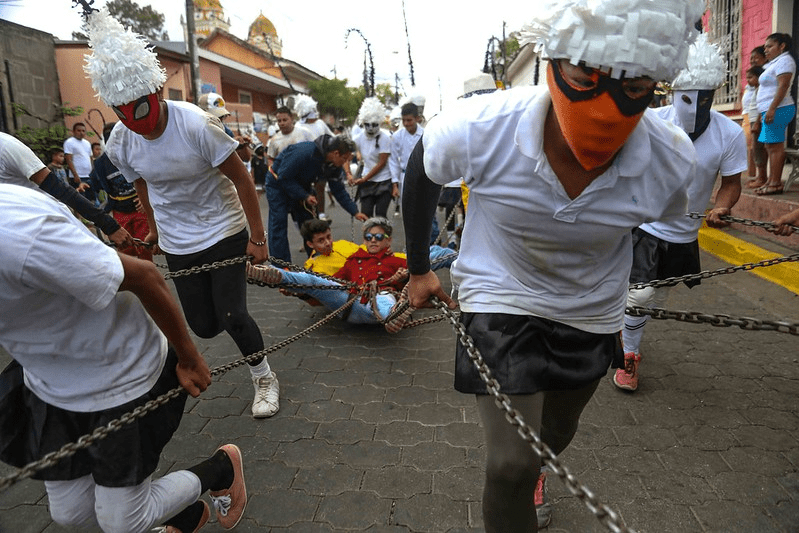 Nicaragua,- Diese Tradition fand am Kardonnerstag und Karfreitag statt, wo das raue Geräusch der Ketten zusammen mit den euphorischen Rufen der Teilnehmer das vorherrschende Geräusch ist.