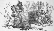 Darstellung eines gescheiterten Versuchs, auf Bäume zu klettern, aus einer Anekdote in Francis Fuller Victors Buch Eleven Years in the Rockies and Life on the Frontier von 1887 (Kapitel 5)