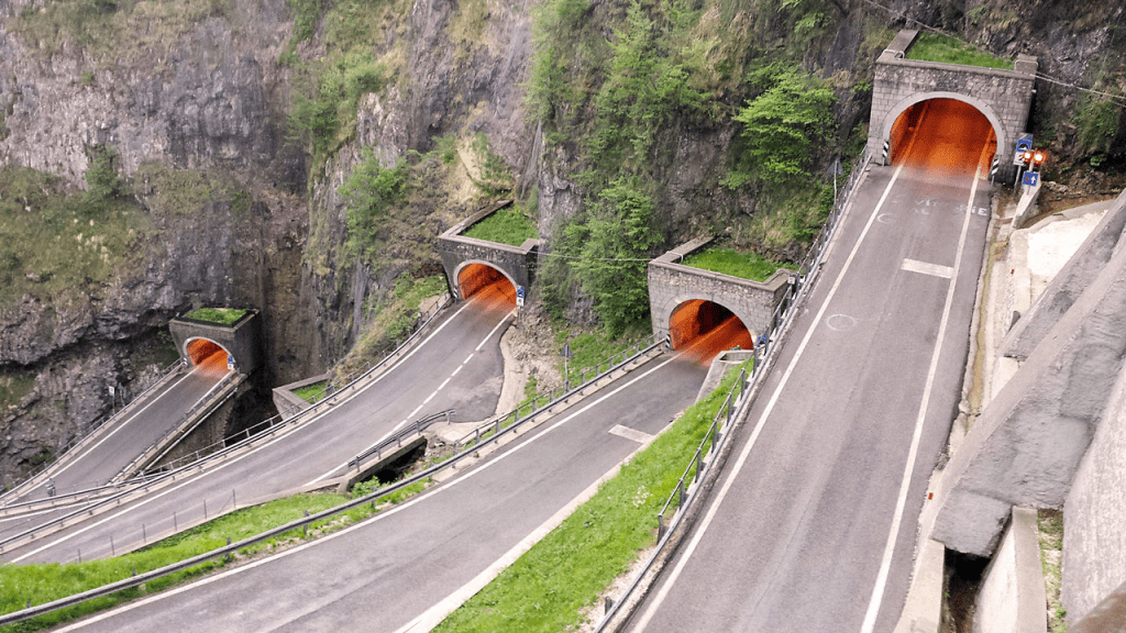 Ein Geheimtipp unterhalb der Dolomiten Richtung Meer ist der Passo San Boldo (706 m) mit seinen fünf engen Kehrtunnels im Fels.