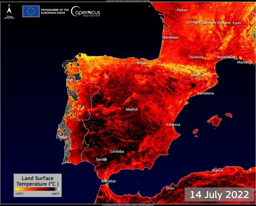 Über 59°C wurden an der Bodenoberfläche in Spanien und 48°C im Süden auf Frankreich gemessen Dies ist nicht „nur Sommer“. Es ist „nur die Hölle“ und wird ziemlich bald „nur das Ende des menschlichen Lebens“ sein, wenn wir mit unserer Klima-Untätigkeit fortfahren.@Melanie_Vogel_