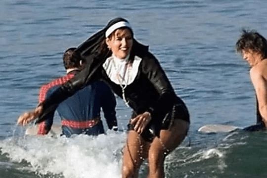 Gesellschaft,- Sommer sonne strandspaß, Es ist beeindruckend, dass sie es geschafft hat, mit ihrer Kleidungs aufs Surfbrett zu steigen, und es ist ebenso beeindruckend, dass sie eine schöne Welle geritten hat! Es ist bereits bekannt, dass Nonnen zu den geheimnisvollsten Menschen auf der Welt gehören. Diese Nonne macht die Welt der Nonnen noch geheimnisvoller, als sie ohnehin schon sind!(travelcatscher)