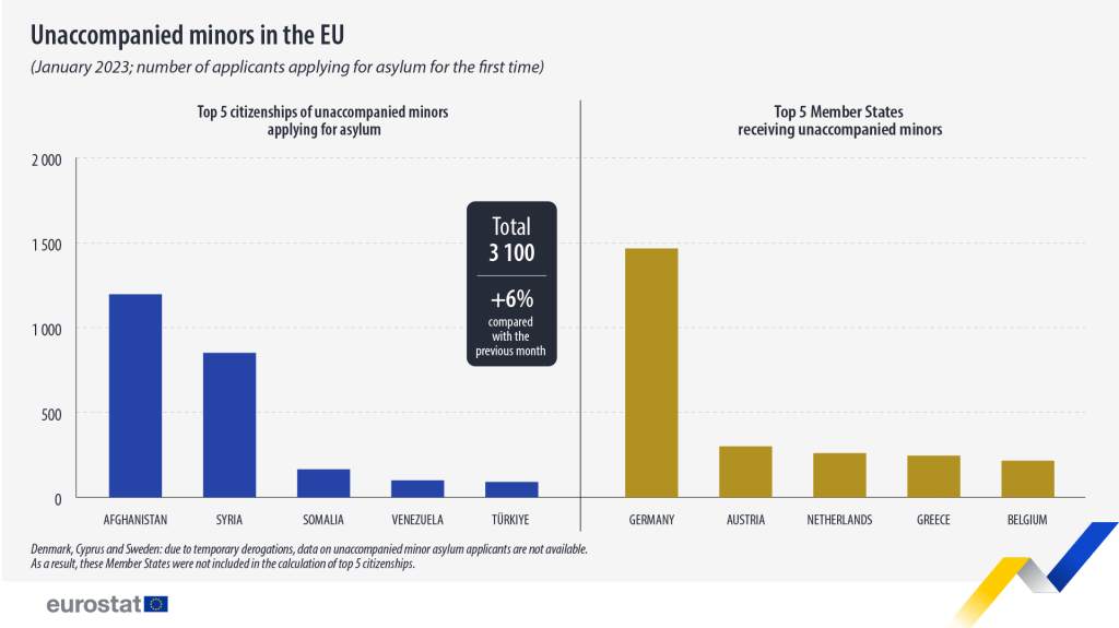 Im Januar 2023 beantragten 3 100 unbegleitete Minderjährige zum ersten Mal Asyl in der EU, +6 % gegenüber Dezember 2022 (2 930).