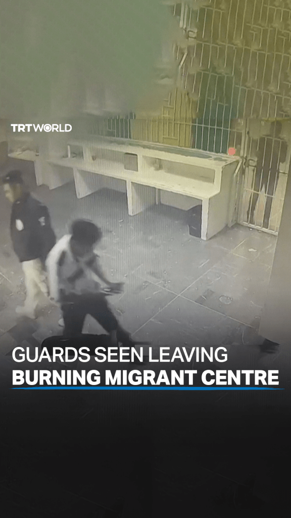 Sicherheitsaufnahmen zeigen Wachen, die gehen, als Flammen eine Einwanderungshaftanstalt in Mexiko verschlingen, in der 38 Migranten bei dem Feuer getötet wurden