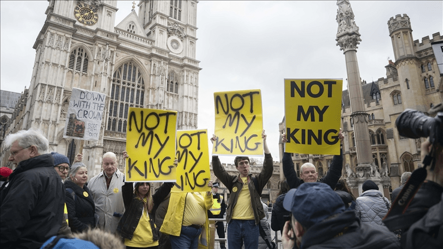 Eine andere Demonstrantin, Liz, sagte Anadolu, dass sie sich der Demonstration anschließe, um gegen die Krönungszeremonie zu protestieren, und fügte hinzu, sie wolle die Menschen darauf aufmerksam machen, dass „sie tatsächlich eine Wahl haben“.
