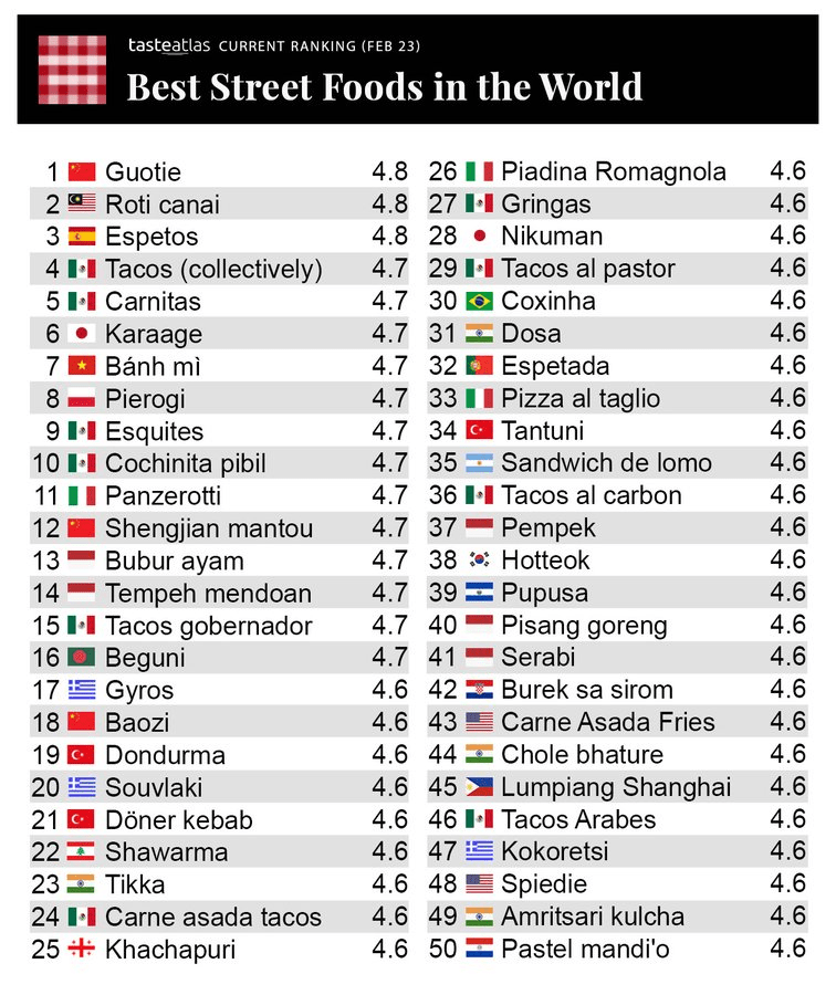 Das Guotie hat chinesischen Ursprung und erschien angeblich zwischen den Jahren 960 und 1279. Eine Tradition, die Jahrhunderte umspannt und in China nach wie vor beliebt ist. Andere bekannte Gerichte standen ebenfalls auf der Liste, wie zum Beispiel: Tacos (Mexiko – Platz 4) und Lomito (Argentinien – Platz 35).