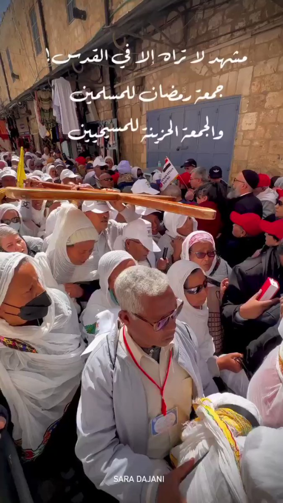 Eine Szene, die man nur in Jerusalem sieht. Muslime haben das letzte Freitagsgebet des Ramadan in der gesegneten Al-Aqsa-Moschee verrichtet, sie treffen Christen, während sie ihre Rituale am Karfreitag praktizieren, den Pfad des Schmerzes gehen und in Richtung der Auferstehungskirche gehen, und am Karsamstag greifen israelische Besatzungstruppen Christen in der Stadt Jerusalem an.