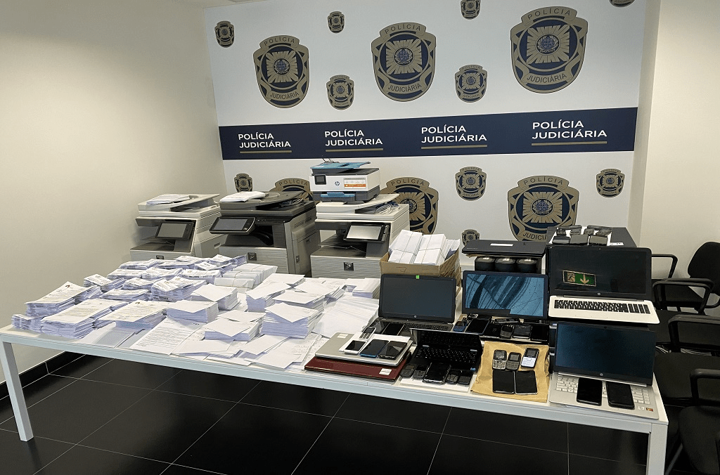 Digitale Beweismittel und gefälschte amtliche Dokumente, die von der Polícia Judiciária, der nationalen Kriminalpolizei Portugals, während der Operation First Light 2022 beschlagnahmt wurden.