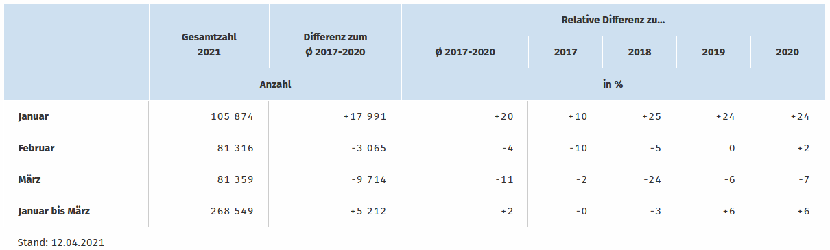 Waren im Januar noch 105.874 Menschen gestorben und damit 17.991 Menschen bzw. rund 20 Prozent mehr als im Durchschnitt der drei Vorjahre, so waren es im Februar noch 81.316 Verstorbene und somit 3.065 Verstorbene oder rund vier Prozent weniger als im Durchschnitt der drei Vorjahre. Für März gibt das Statistische Bundesamt 81.359 Verstorbene an, was 9.714 Verstorbene oder rund elf Prozent weniger als im Dreijahresdurchschnitt des Vergleichszeitraums entspricht.
