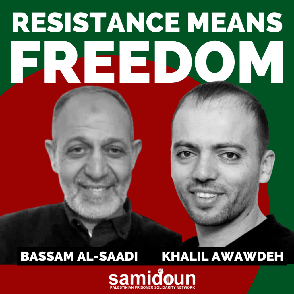Das Samidoun Palestinian Prisoner Solidarity Network ruft alle auf, sich zu organisieren, ihre Stimme zu erheben, zu protestieren und die sofortige Freilassung von Khalil Awawdeh, Bassam al-Saadi und allen palästinensischen Gefangenen in zionistischen Besatzungsgefängnissen zu fordern.