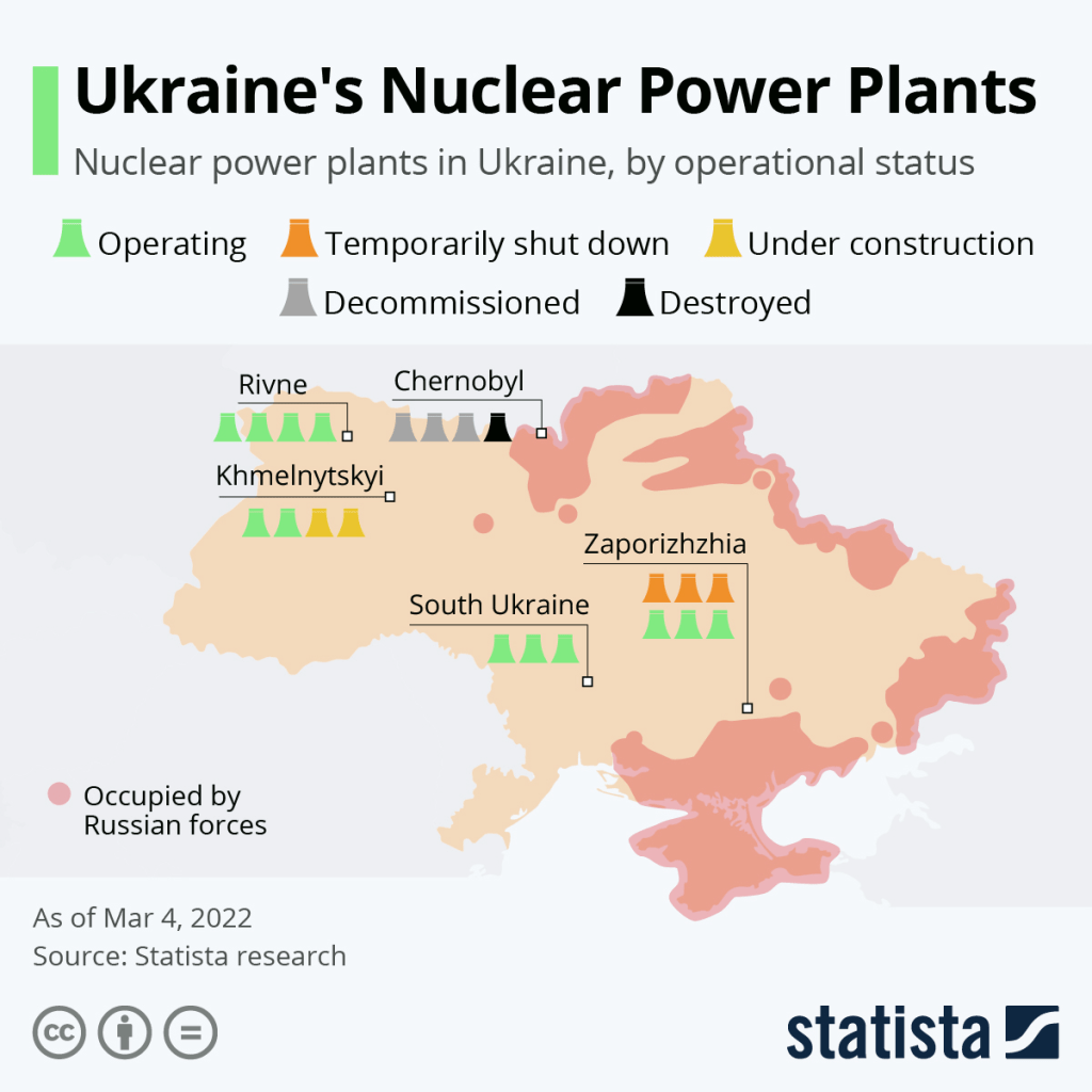 Das Land hat vier Kernkraftwerke in Betrieb, darunter das leistungsstärkste Europas in Zaporizhzhia in der Nähe der Krim.