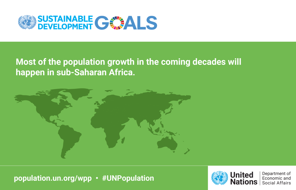 Mehr als die Hälfte des globalen Bevölkerungswachstums bis 2050 wird voraussichtlich in Afrika stattfinden. Afrika hat die höchste Bevölkerungswachstumsrate in den großen Regionen. Die Bevölkerung in Subsahara-Afrika wird sich voraussichtlich bis 2050 verdoppeln. Auch die Bevölkerung Afrikas wird voraussichtlich schnell zunehmen, selbst wenn die Fruchtbarkeitsraten in naher Zukunft erheblich zurückgehen. Ungeachtet der Ungewissheit über zukünftige Fruchtbarkeitstrends in Afrika sorgt die große Zahl junger Menschen auf dem Kontinent heute – diejenigen, die voraussichtlich in den kommenden Jahren das Erwachsenenalter erreichen und Nachwuchs haben werden – dafür, dass der Kontinent eine wichtige Rolle bei der Gestaltung der Größe und des Kontinents spielt Verteilung der Weltbevölkerung in den kommenden Jahrzehnten.